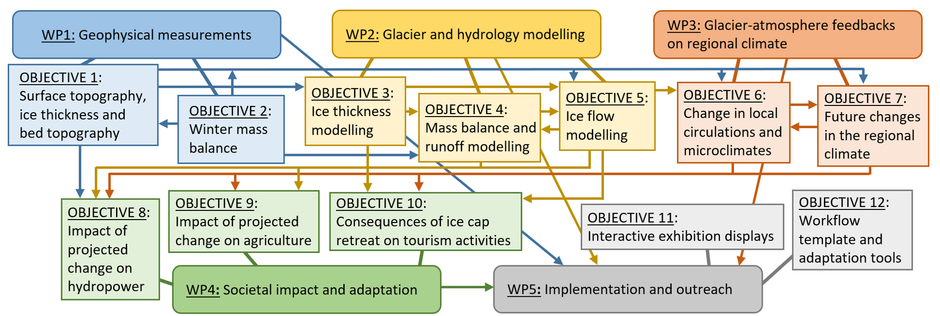 Ice thickness modelling, mass balance and runoff modelling; ice flow modelling